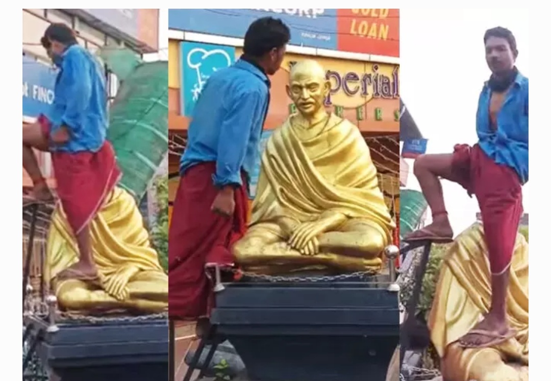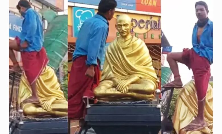 ഗാന്ധി പ്രതിമയുടെ മുഖത്തടിച്ചും അസഭ്യം പറഞ്ഞും മദ്യപാനിയുടെ പരാക്രമം; വ്യാപക പ്രതിഷേധം